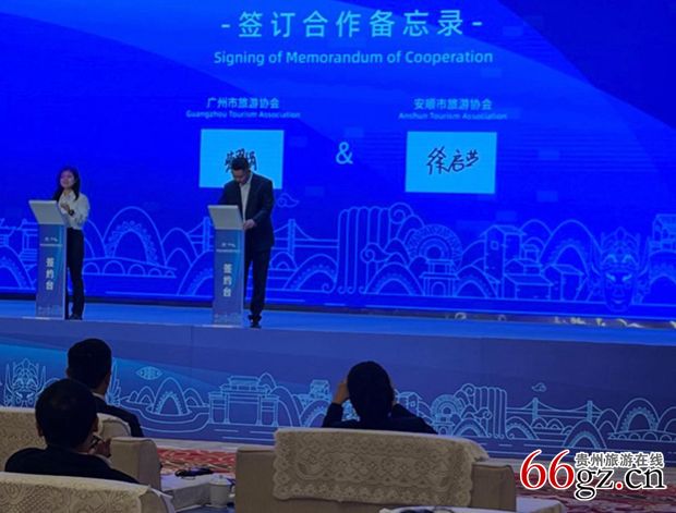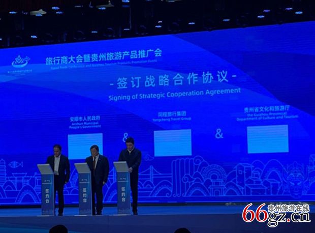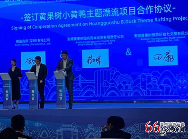 在电子签约环节,共进行5轮签约:贵州省文化和旅游厅副厅长陈震、中国文化传媒集团副总编辑叶飞签订战略合作协议,陈震副厅长与同程旅行集团签订战略合作协议,安顺市人民政府副市长贺未泓与同程旅行集团副总裁李明浩签订战略合作协议,广州市旅游协会、安顺市旅游协会签订战略合作协议,广州市旅游协会副秘书长劳翠娟与安顺市旅游协会副秘书长徐启荣签约,德盈商贸(深圳)有限公司、安顺黄果树国有资本运营有限责任公司、安顺黄果树旅游区拾七文旅有限公司代表签订“黄果树小黄鸭主题漂流项目合作协议”。
