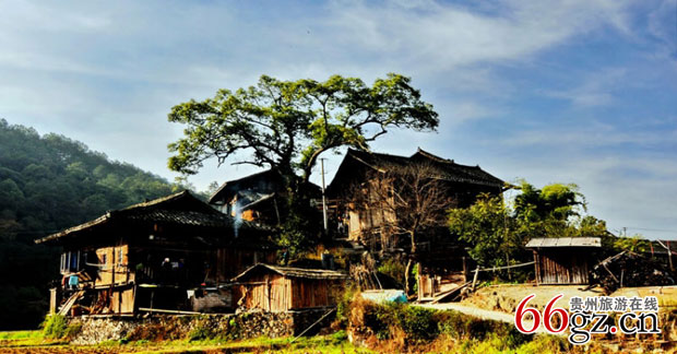 百年老树屹立在寨里的高处成了标致风景,因其年代久远、粗壮挺拔,被视为"神树"深受村民的尊敬。传说抚摸树根部会得平安幸福的保佑。