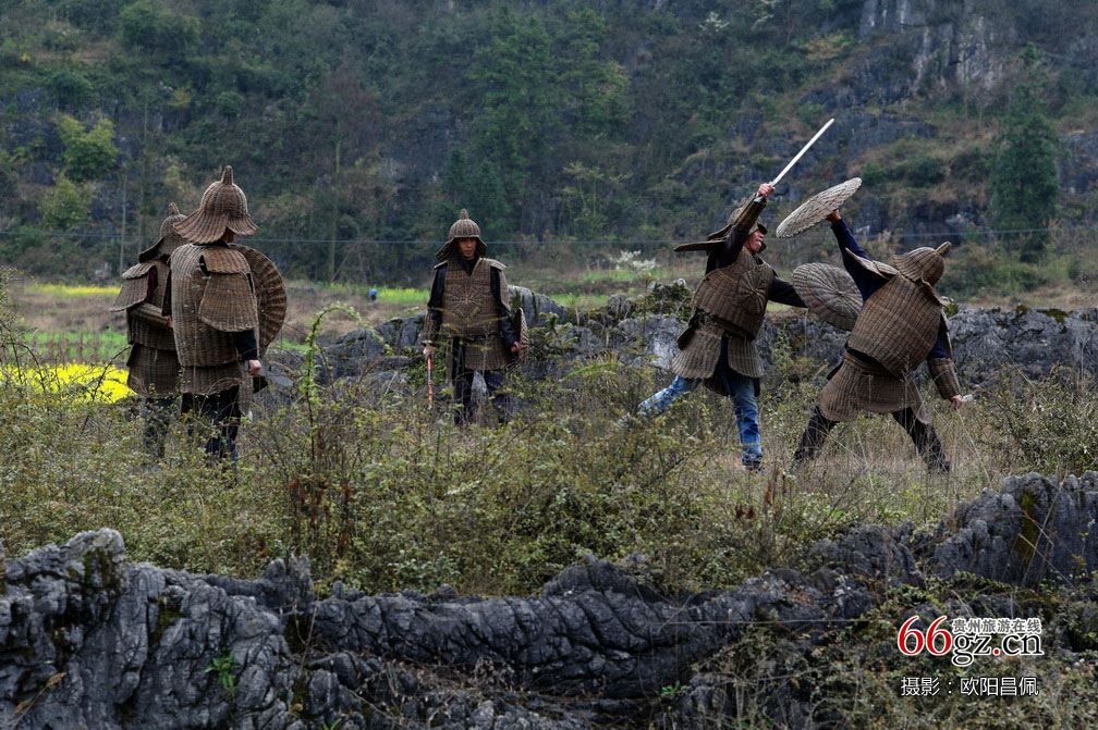 听说歪寨布依寨有一支由农民扮演的藤甲兵,十分好奇,便与“贵在责任 贵在关爱” 第二届全国网络摄影大赛月赛最佳获奖者摄影采风团员们一起来到歪寨。不多一会,几名身