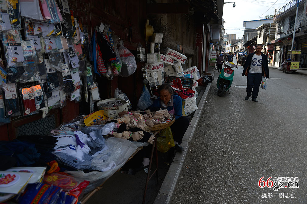 从板底采风回到威宁县城已是下午,此时的老街太阳透过窄窄的街道斜斜的照在赶路的人身上,拖出长长的影子。偶尔有身着彝族回族服装在的人走在老街上。高原火辣的阳光把他们晒成古铜的肤色,黑里透红。狭窄的路上车辆行人穿行其中,连只有一米不到的人行道上也摆着摊子买东西,可想而知高峰时一定是水泄不通的。想买些洋芋带回家,结果人家说要按袋卖,最好的卖一块二,必须买一百斤以上,求了半天卖了十斤。街边卖叶子烟的特别多,一路上看到叼着长烟杆,无所顾忌地吧哒吸着,没有人介意。也没有人介意扫街拍摄的人,匆忙的人们各自匆忙着。