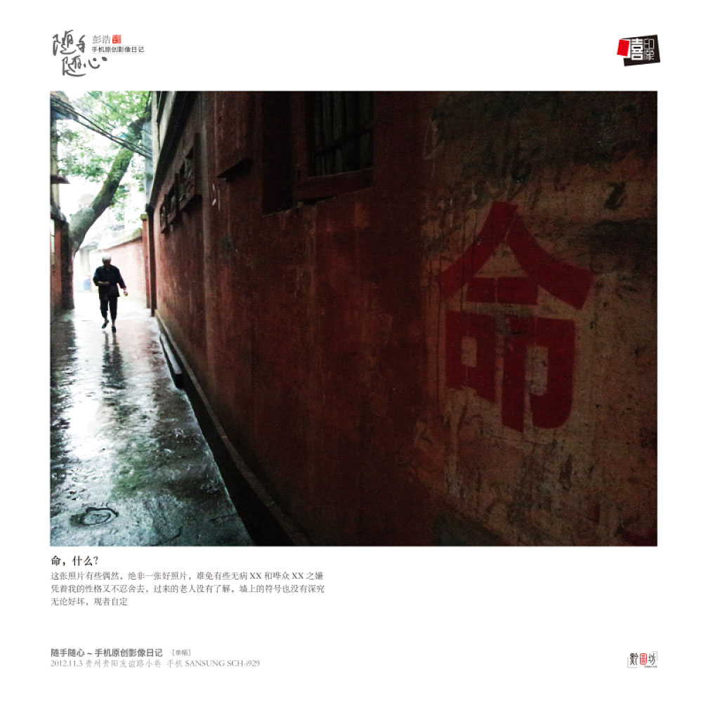 2013年6月8日15点,由嘻印像光影长廊(嘻客咖啡)、当代影像文化传播中心、贵州新目标文化传播有限公司、贵州鼎元文化传播有限公司、甲秀楼风景区管理处主办,贵州省青年摄影家协会、腾讯贵阳站、那些年酒业、博伟航拍、黔图坊专业影像协办的“甲秀光影*嘻印像”彭浩手机原创影像日记展暨手机影像文化交流会在贵阳市甲秀楼翠微园开展。