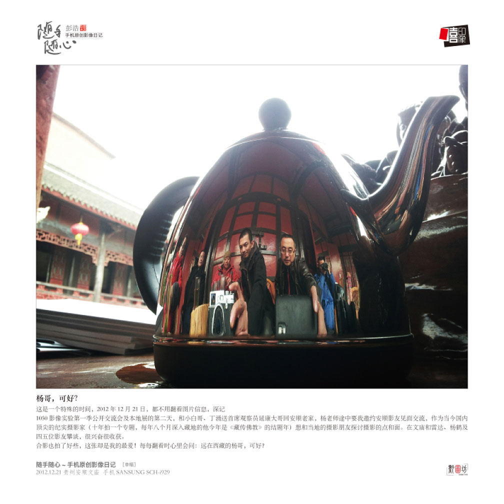 2013年6月8日15点,由嘻印像光影长廊(嘻客咖啡)、当代影像文化传播中心、贵州新目标文化传播有限公司、贵州鼎元文化传播有限公司、甲秀楼风景区管理处主办,贵州省青年摄影家协会、腾讯贵阳站、那些年酒业、博伟航拍、黔图坊专业影像协办的“甲秀光影*嘻印像”彭浩手机原创影像日记展暨手机影像文化交流会在贵阳市甲秀楼翠微园开展。