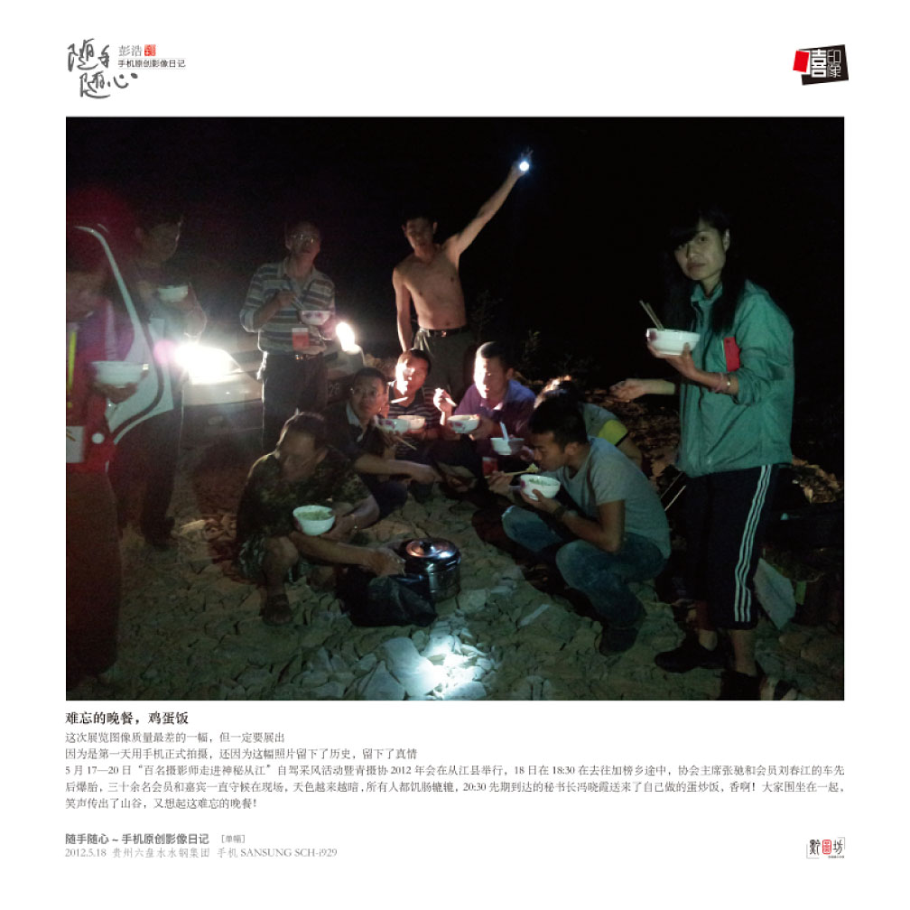 2013年6月8日15点,由嘻印像光影长廊(嘻客咖啡)、当代影像文化传播中心、贵州新目标文化传播有限公司、贵州鼎元文化传播有限公司、甲秀楼风景区管理处主办,贵州省青年摄影家协会、腾讯贵阳站、那些年酒业、博伟航拍、黔图坊专业影像协办的“甲秀光影*嘻印像”彭浩手机原创影像日记展暨手机影像文化交流会在贵阳市甲秀楼翠微园开展。