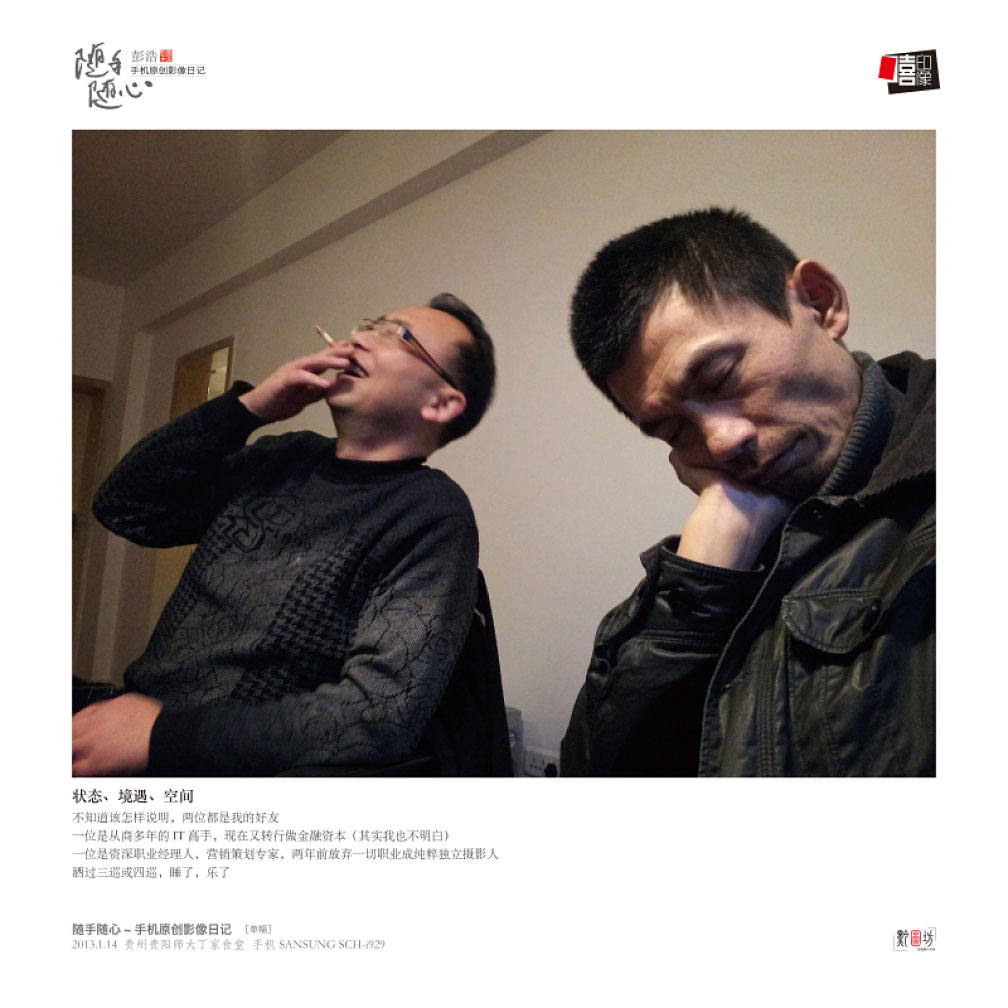 这次手机摄影展是彭浩用了一年的时间,采用手机纪实拍摄的手法与微信实时传播的方式,记录了身边的各式各样的生活与场景。展出作品1500余幅,其中,影像日记作品100套,单幅作品40幅,