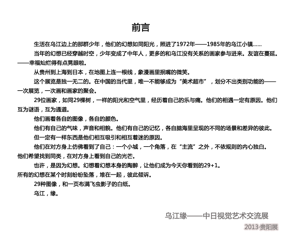 2013年8月18日下午,由上海现代艺术家陈墙、潘微,贵州著名油画家陈红旗、黄光辉联合发起,知名策展人彭天朗、伍艺空间创始人文心联合策展,“乌江源”展览策展工作组主办,伍艺空间、219文化创意广场大力协办的“乌江源”——中日视觉艺术交流展(2013·贵阳),在贵阳219文化创意广场举行开幕式,届时,来自日本、上海和贵州的29位参展艺术家、各界嘉宾和省内外媒体朋友出席此次开幕式。
