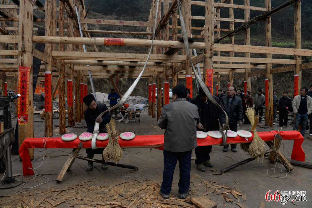 少数民族立新房--上午11点35分,准备吊起房子中梁柱