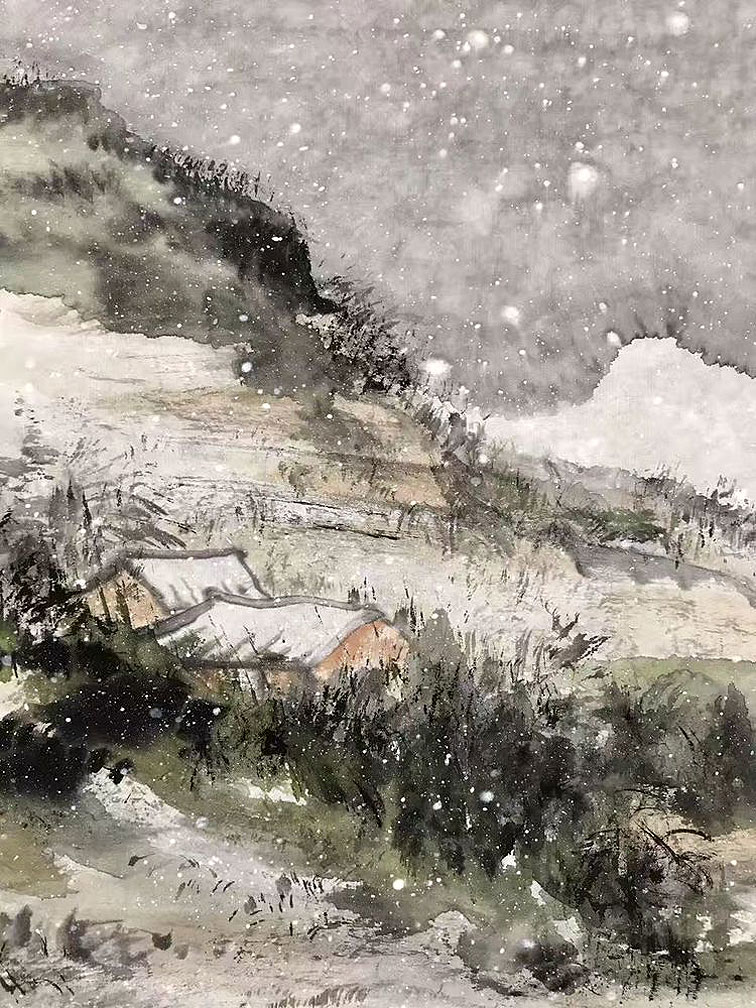 【畫禪精舍山水·筑郊春雪】紙本水墨設色.尺寸:138x68cm(局部图)