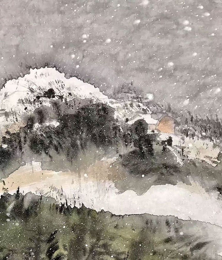 【畫禪精舍山水·筑郊春雪】紙本水墨設色.尺寸:138x68cm(局部图)