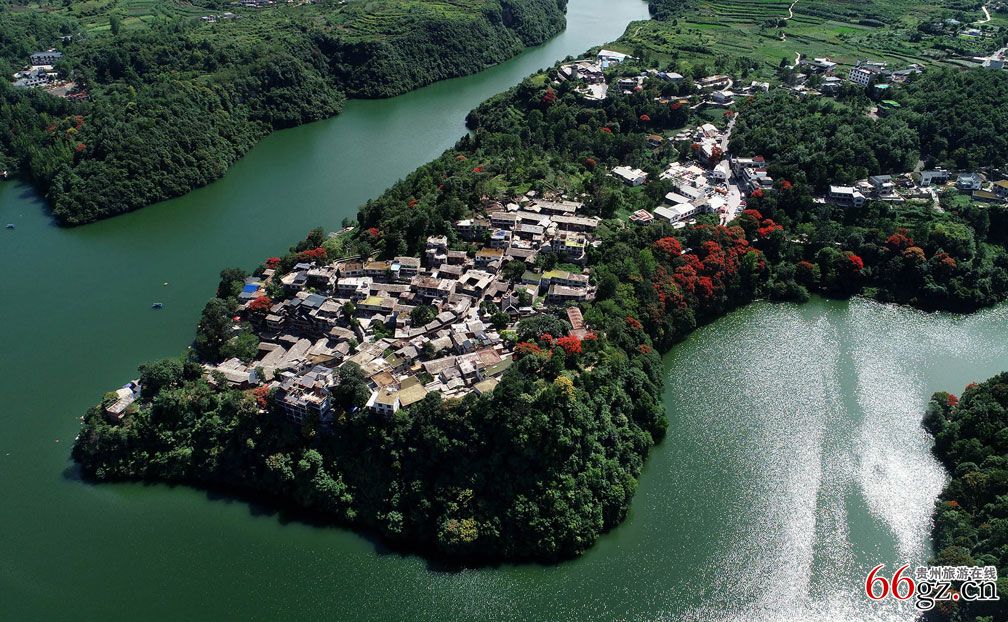 2018年7月27日,无人机高空拍摄的生态环境优美的贵州省贵阳市花溪区石板镇镇山布依族村。盛夏时节,阳光灿烂, 俯瞰三面环水的半岛式布依山寨绿意盎然,由时代久远的石头搭建的民居在栾树红色果实点缀下, 美不胜收。镇山布依族村是集真山真水,民族建筑,历史遗存于一体的布依族村寨,1995年,批准为贵州省级文物保护单位和民族文化村,2001年中国和挪威合作国际生态文化项目落户镇山村,建成”中国.贵州花溪布依族生态博物馆” 。