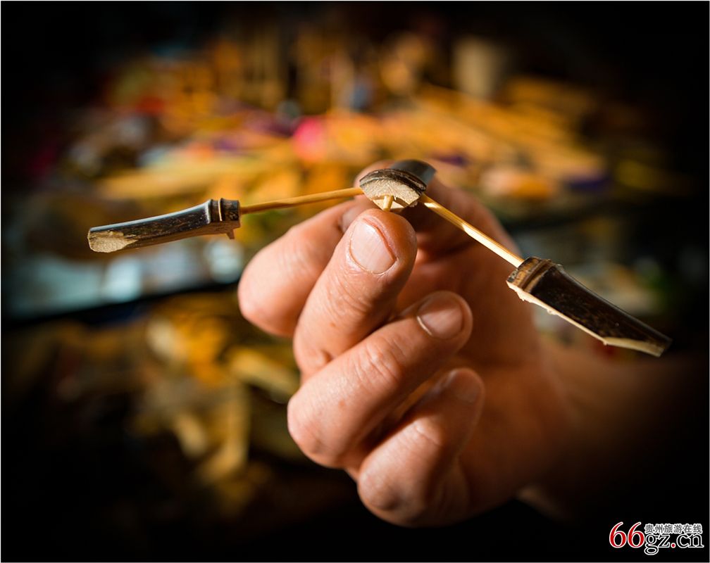 在花溪青岩古镇一个古朴的店铺里,手艺人罗勇专心致志选出几块竹条,削形状,打孔,拼接,粘接,两三个小时后,一个童年记忆里的竹蜻蜓栩栩如生出现在我们面前。罗勇从十岁跟爷爷学木匠,爷爷以前是修木建筑的掌墨师,曾修建过寺庙和木楼等等。罗勇十六岁就近木工厂做小木匠,经过几十年的刻苦练习,他的木工技艺日趋成熟精湛。现在他以寻找记忆里的传统手工玩具为主题,精心制作出许多小木雕和竹雕作品,再现祖辈智慧,传播与感受传统手艺的快乐。