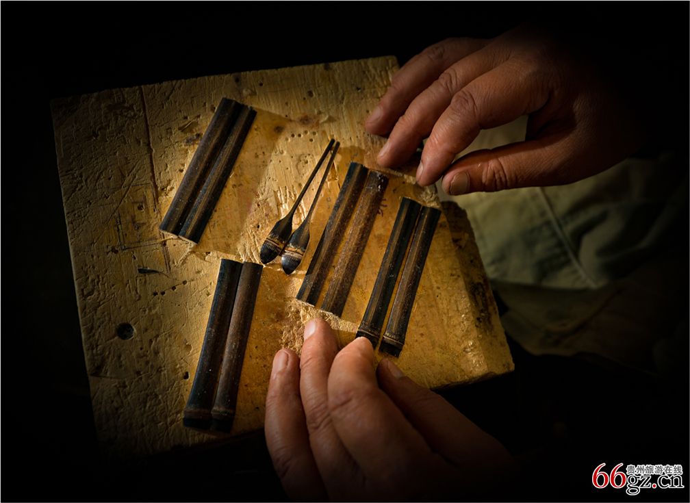 在花溪青岩古镇一个古朴的店铺里,手艺人罗勇专心致志选出几块竹条,削形状,打孔,拼接,粘接,两三个小时后,一个童年记忆里的竹蜻蜓栩栩如生出现在我们面前。罗勇从十岁跟爷爷学木匠,爷爷以前是修木建筑的掌墨师,曾修建过寺庙和木楼等等。罗勇十六岁就近木工厂做小木匠,经过几十年的刻苦练习,他的木工技艺日趋成熟精湛。现在他以寻找记忆里的传统手工玩具为主题,精心制作出许多小木雕和竹雕作品,再现祖辈智慧,传播与感受传统手艺的快乐。