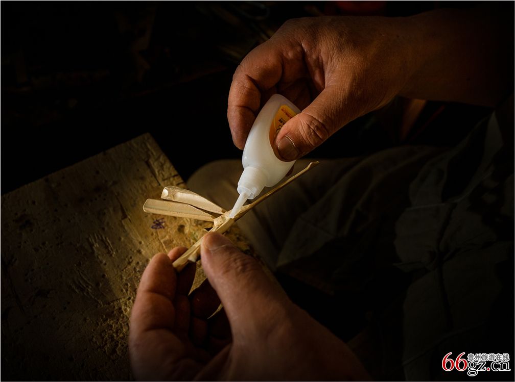 在花溪青岩古镇一个古朴的店铺里,手艺人罗勇专心致志选出几块竹条,削形状,打孔,拼接,粘接,两三个小时后,一个童年记忆里的竹蜻蜓栩栩如生出现在我们面前。罗勇从十岁跟爷爷学木匠,爷爷以前是修木建筑的掌墨师,曾修建过寺庙和木楼等等。罗勇十六岁就近木工厂做小木匠,经过几十年的刻苦练习,他的木工技艺日趋成熟精湛。现在他以寻找记忆里的传统手工玩具为主题,精心制作出许多小木雕和竹雕作品,再现祖辈智慧,传播与感受传统手艺的快乐。