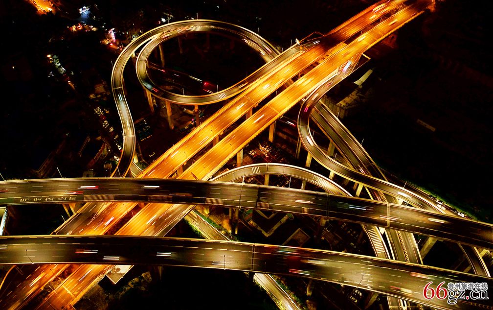 本组图片为“贵阳最复杂立交桥”黔春立交桥的的俯瞰夜景。黔春立交北承北站立交、南接延安南路匝道、贵阳街立交,并直接与东西向主干道北京西路相交,可服务和尚坡、头桥二桥、花果园片区,快捷到达长岭南路、火车北站、高新区等目的地,是贵阳市的重要交通节点,也是贵阳目前最大的立交桥。