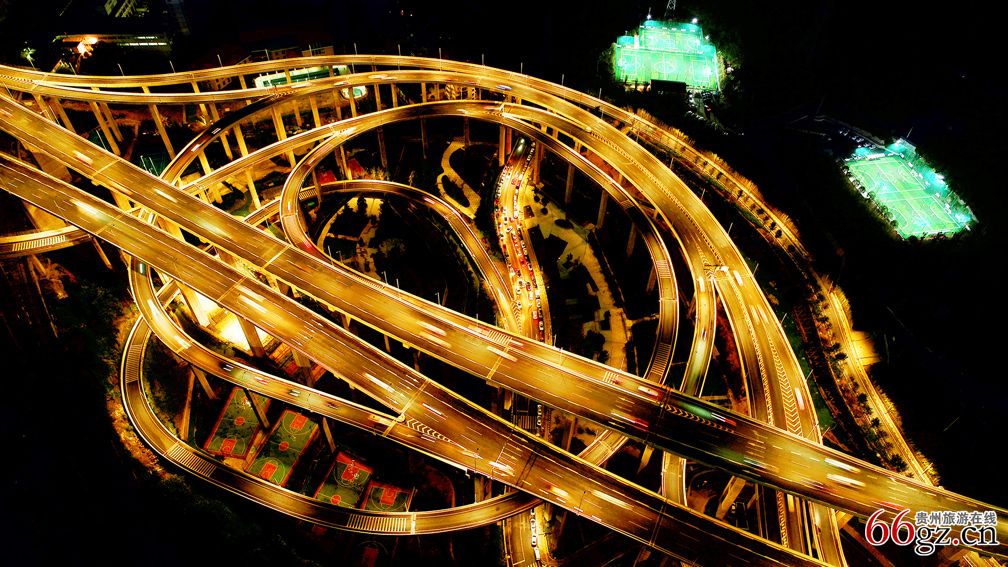 本组图片为“贵阳最复杂立交桥”黔春立交桥的的俯瞰夜景。黔春立交北承北站立交、南接延安南路匝道、贵阳街立交,并直接与东西向主干道北京西路相交,可服务和尚坡、头桥二桥、花果园片区,快捷到达长岭南路、火车北站、高新区等目的地,是贵阳市的重要交通节点,也是贵阳目前最大的立交桥。