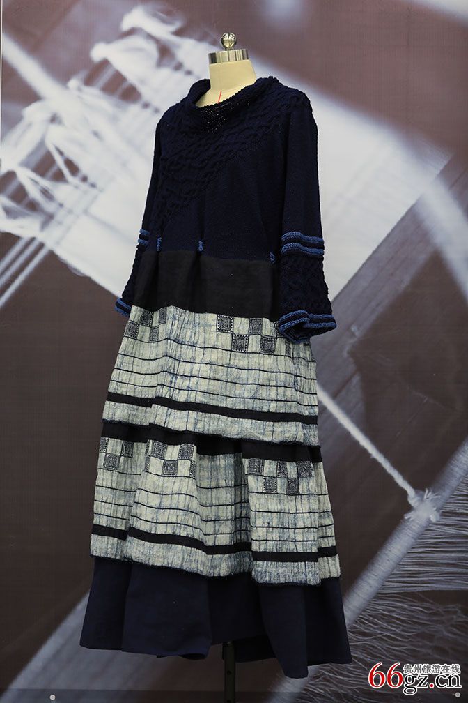 简介:织布结合,采用牛仔染色工艺的进口棉线,棒针编织阿兰花样,其所独具的流畅、立体效果,与苗绣技法、几何纹样有着异曲同工之妙,再拼接贵定小花苗亚麻蜡染百褶裙成塔裙,赋予蜡染服饰新生。