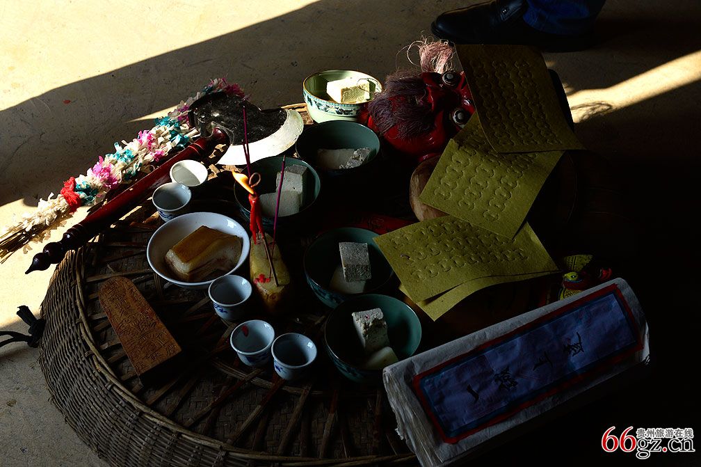 2019年5月23日花溪傩文化公园傩堂内正在举行还愿仪式。酧愿信士张女士说多年前在老家许的愿,如今全家从印江搬到金阳,一直没机会回老家还愿,知道此处可以还愿后便按老家的规矩前来,虔诚地跟着傩师做着每一道仪式。