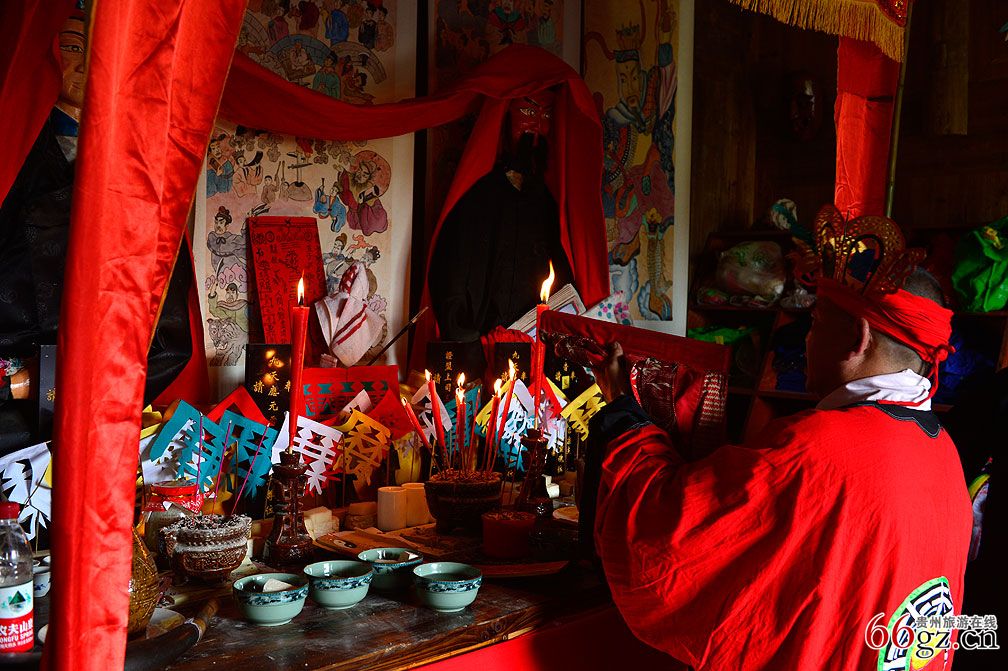 2019年5月23日花溪傩文化公园傩堂内正在举行还愿仪式。酧愿信士张女士说多年前在老家许的愿,如今全家从印江搬到金阳,一直没机会回老家还愿,知道此处可以还愿后便按老家的规矩前来,虔诚地跟着傩师做着每一道仪式。