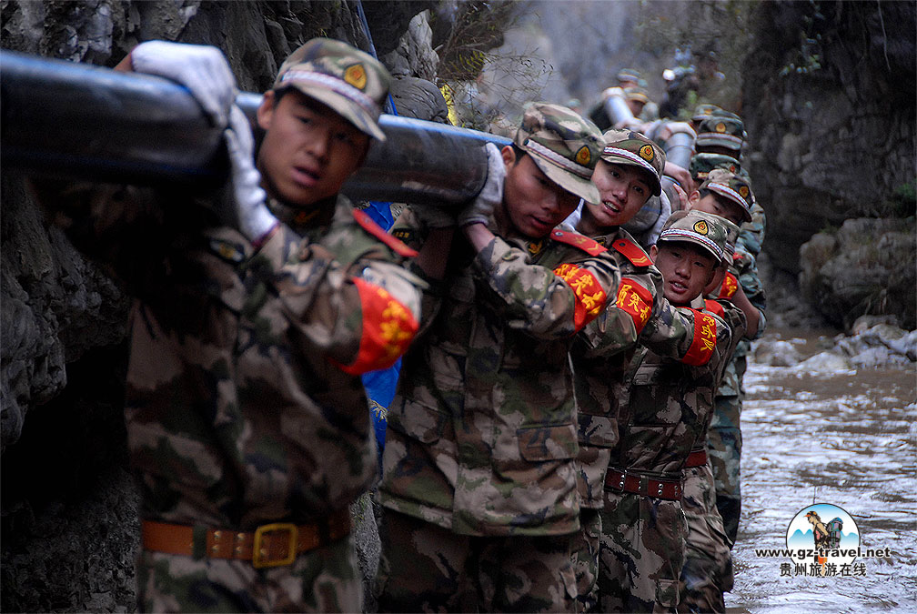 2010年4月2日,贵州省丹寨县“引水入城”抗旱工程进入了攻关阶段,一段长达300多米,重达3吨的输水管道要途经深山里的峡谷,峡谷里流淌着齐腰深的河水,当日的气温只有8摄氏度,河水冰凉刺骨。关键的时刻,300余名援建武警、消防官兵与丹寨县应急民兵分队的战士们临危不惧,跳入水中肩扛手抬,用了3个多小时,完成了这一艰巨的任务,为整个引水工程的胜利竣工奠定了坚实的基础。