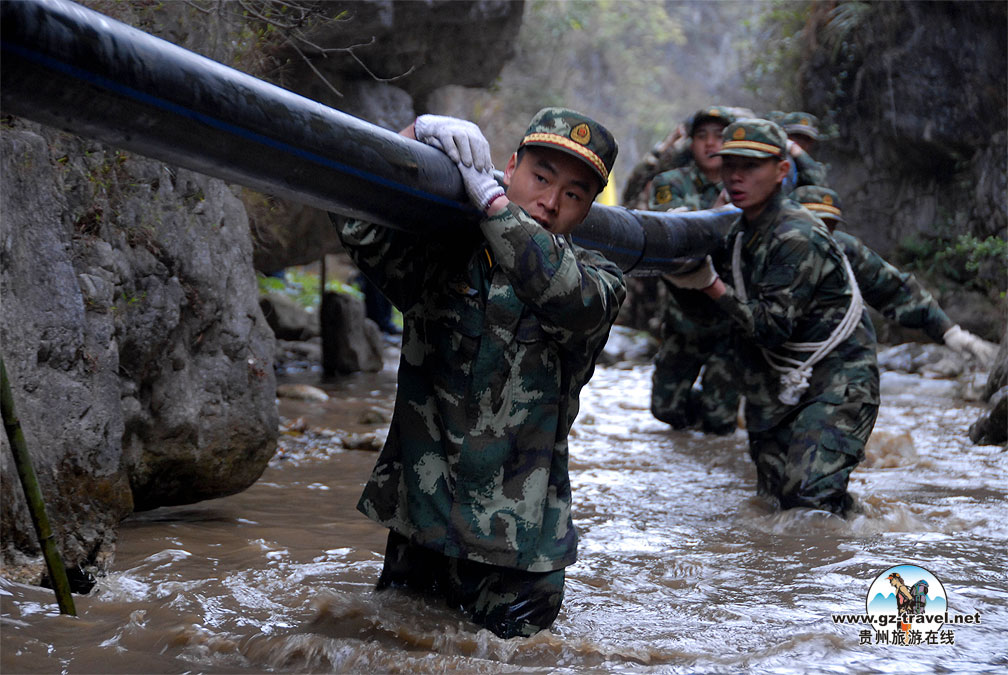 2010年4月2日,贵州省丹寨县“引水入城”抗旱工程进入了攻关阶段,一段长达300多米,重达3吨的输水管道要途经深山里的峡谷,峡谷里流淌着齐腰深的河水,当日的气温只有8摄氏度,河水冰凉刺骨。关键的时刻,300余名援建武警、消防官兵与丹寨县应急民兵分队的战士们临危不惧,跳入水中肩扛手抬,用了3个多小时,完成了这一艰巨的任务,为整个引水工程的胜利竣工奠定了坚实的基础。