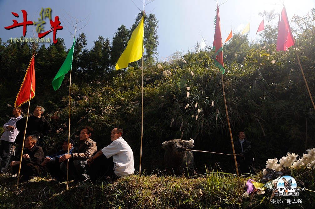 本网讯 2010年11月1日,榕江县乐里镇宰孖村迎来一年一度的斗牛大赛。来自往里、仁里七十二寨的侗族同胞欢聚在这里观看斗牛比赛。此次斗牛比赛共有九对牛参加,每一头牛都是代表一个寨子,斗牛是寨子精神力量,都是由寨上的每户出资、出力轮流饲养。