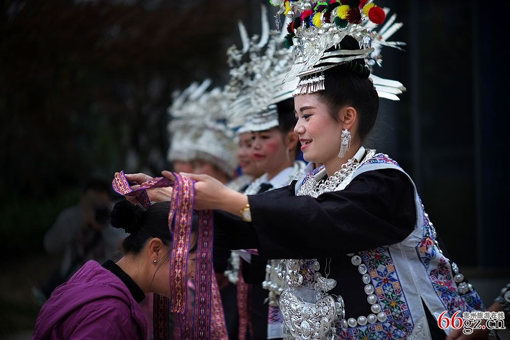 在剑河周末聚活动的迎宾仪式上,苗族姑娘为来宾献上了自己亲手编织的花带,表示祝福!在一个相对杂乱的大场景下,作者巧妙的避开了很多出现在画面里的干扰信息,只突出了为来宾挂上花带的瞬间。苗姑娘热情的表情和来宾诚挚的姿势,相互之间的呼应,形成了一个安静祥和的氛围。
