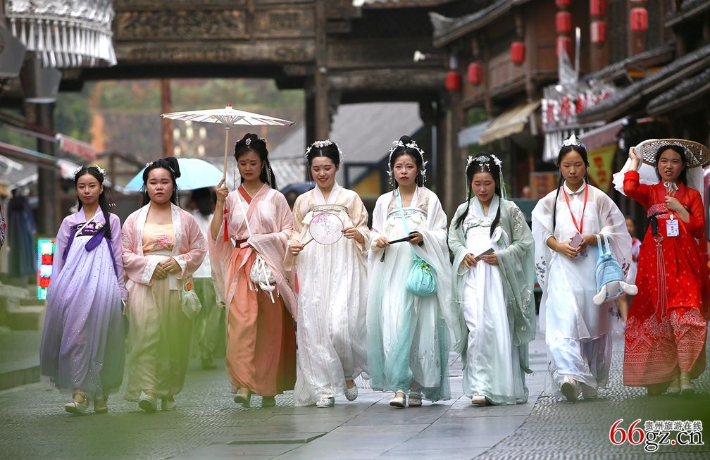 7月27日 ,下司古镇《首届九栖汉文化节》在古镇上演,汉服爱好者们身着传统服饰漫步街巷,为古镇增添一道美丽的风景。活动当天,伴随着古风的伴奏,200余名汉服爱好者们身着华美汉服列队而行。悠长的古镇石板街上,古朴的建筑与大气端庄的汉服相映成趣,古韵的美感在举手投足间散发出来。清风徐徐,衣袂飘飘,汉服之美,尽在其中。诗意的自然风光、丰富的历史积淀与中华传统汉服文化相结合,迸发出了独特的魅力,引得游客们纷纷驻足观赏,拍照留念。