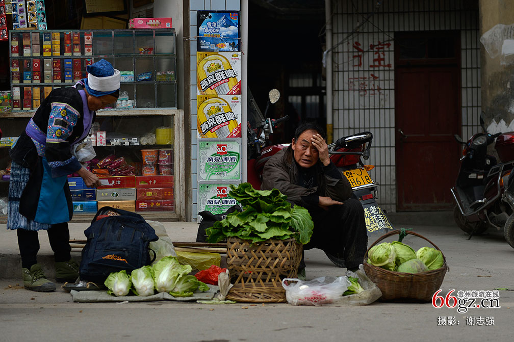 在贵定老城集市,无论是山珍野味,抑或是柴米油盐,无论是竹器木雕,还是碗筷针线,在这里都可以找到。这里的东西大多是农民从家带来的新鲜货,地上铺张塑料布或是麻袋,蔬菜瓜果堆放上面,人就坐在背篓上,守着。这样的巷子在我眼里永远色彩鲜艳,生机勃勃。鲜红的西红柿,橘红的柿子和胡萝卜,黄色的老南瓜,紫色的形状不太好看的茄子,暗红明黄的红薯,绿色的最多,堆成堆的大白菜小白菜,靠着白菜的生菜青菜瓢儿菜,洗净拣好捆成小撮码得整整齐齐的芫荽,还带着泥巴的小葱和蒜苗,老婆婆们特意用塑料袋装着摆在最前面的豌豆苗菠菜茼蒿鱼香菜..