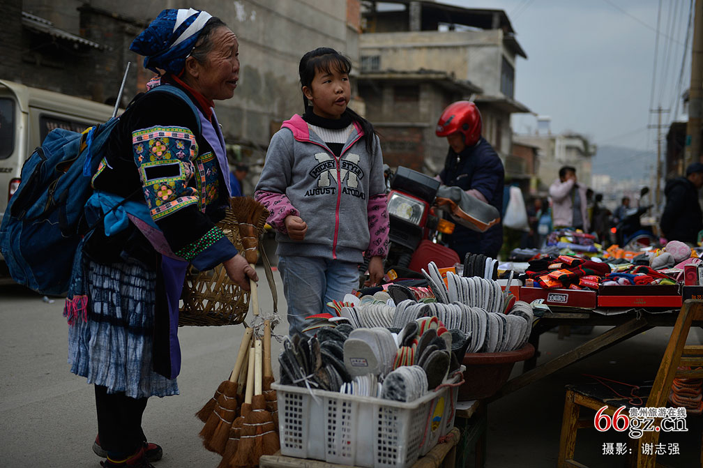 在贵定老城集市,附近的苗族把自己种的作物背到集市上卖,卖了的钱就换成自己需要的物品带回家中。虽然现代社会对传统文化有冲击的同化的趋势,但是在这样的集市上,苗族女人们依然穿着盛装。