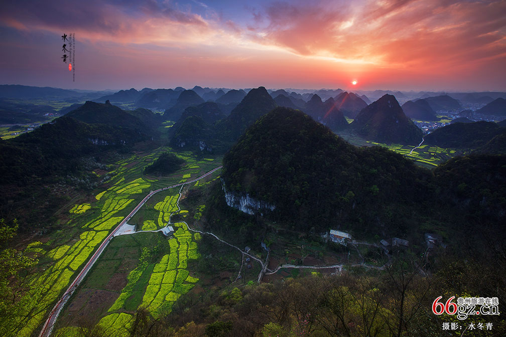 阳春三月,贵州黔西南一带,地上遍地菜花香,山上满眼是春色。这里有着《中国国家地理》“选美中国”活动评选为“中国最美的五大峰林”第三名的万峰林,山峦、田野、河流、村寨、树林融为一体,形成罕见的峰林田园风光。万峰湖的日落,山峰倒影在湖水中,景色旖旎。被誉为“地球上一道美丽疤痕”的马岭河大峡谷,气势磅礴的瀑布群从山崖上倾泻而下,气势壮观!3月的龙宫,让人震撼而迷恋的是那漫及天涯的油菜花,流光溢彩,耀眼夺目。