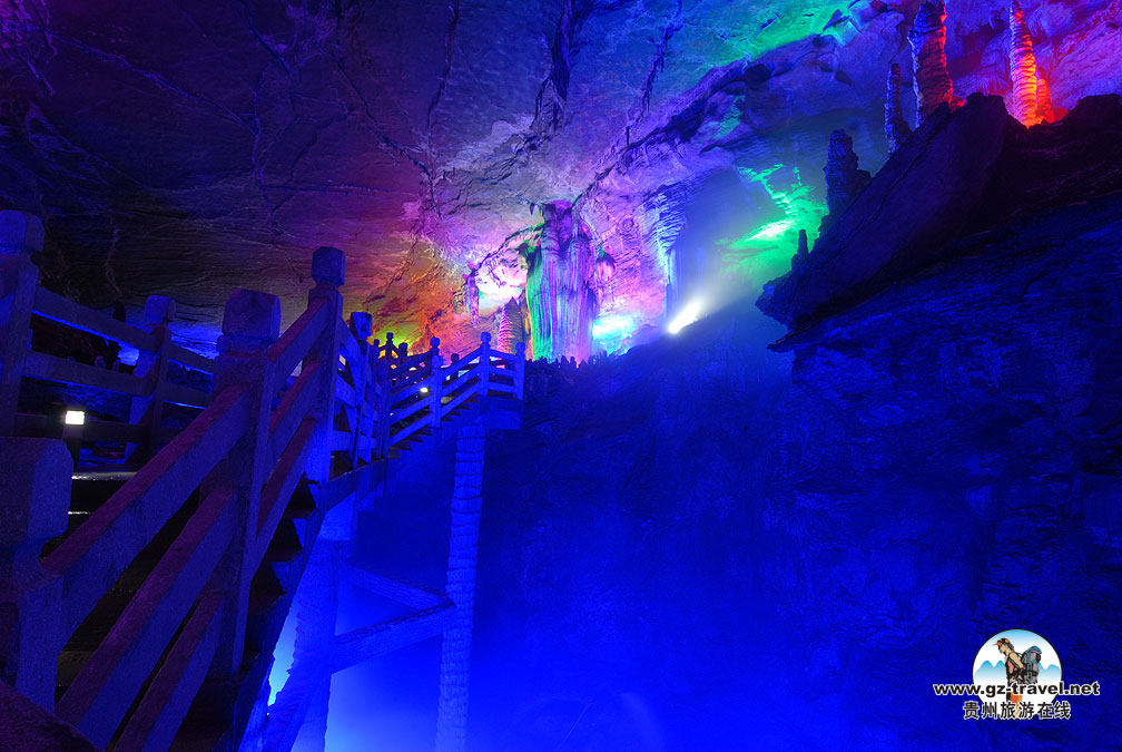 九龙洞,国家级风景名胜区,位于贵州铜仁境内的锦江边的半山腰上,局铜仁市区约20余公里。九龙洞前临锦江,后倚六龙山,主洞全长3200米,洞内最高处达80余米,自然分为7个大厅,一个天厅和一道暗河,总面积8万平方米。洞内钟乳石错落林立,在灯光的勾画下光怪陆离,五彩斑斓,如梦如幻著名的景观有九龙擎天,海螺、水母、扇贝、独柱擎天、倒挂莲花等等,惟妙惟肖令人叹为观止。