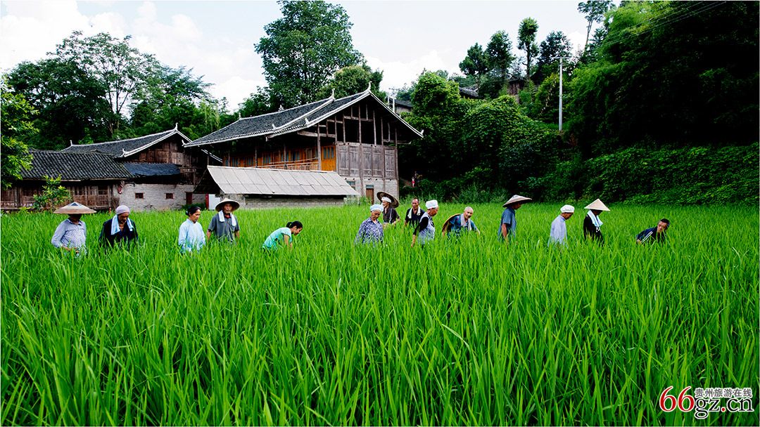 石阡薅草锣鼓村民寨老带领村民下田薅草