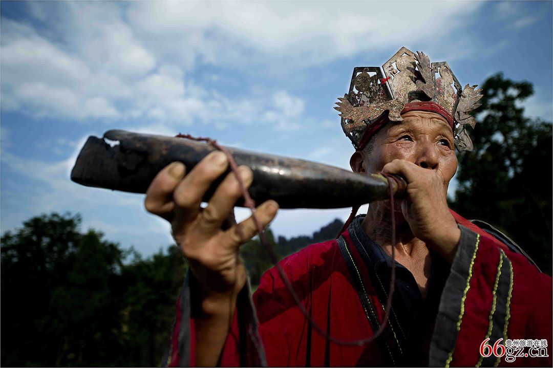 石阡非物质文化遗产傩技上刀山承人在开坛上做上刀山法祀出门吹牛角