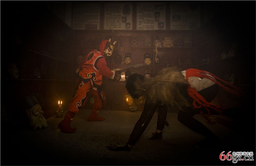 傩堂戏又称傩戏,是流传于梵净山区江口、印江、石阡等地的一种民间传统戏剧形式,具有明显的地域文化特征。其剧目的形式和内容作为我国古代戏剧发展的雏形,是研究我国古代戏剧的“活化石”。组图为江口县傩文化协会发起协会会长,著名的中国傩文化非物质文化遗产传承人,苗族傩文化第十六代传承人石东平大师表演傩戏《钟馗斩鬼》。