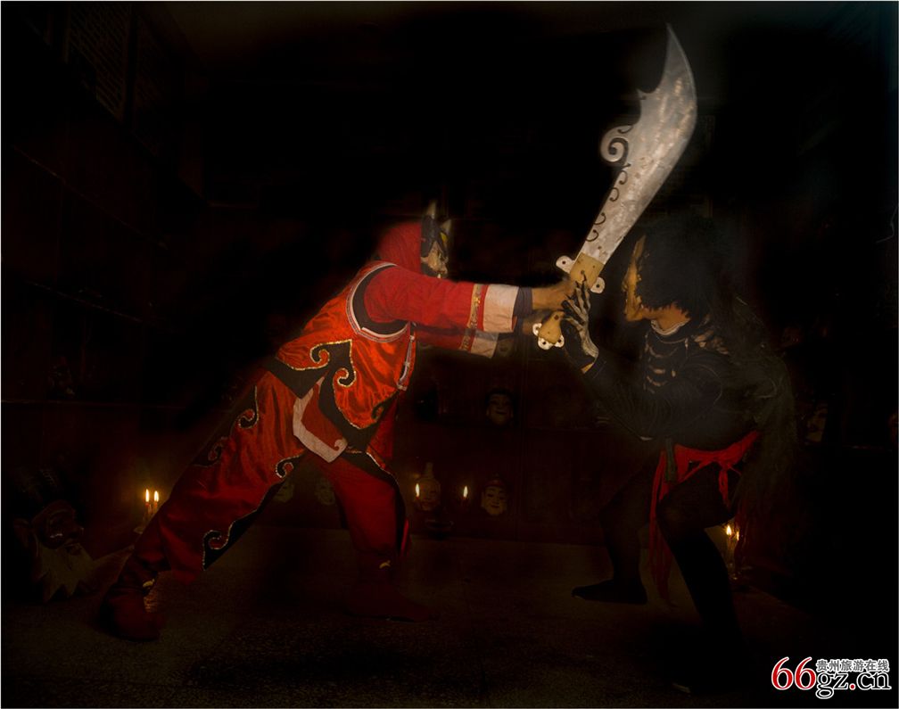 傩堂戏又称傩戏,是流传于梵净山区江口、印江、石阡等地的一种民间传统戏剧形式,具有明显的地域文化特征。其剧目的形式和内容作为我国古代戏剧发展的雏形,是研究我国古代戏剧的“活化石”。组图为江口县傩文化协会发起协会会长,著名的中国傩文化非物质文化遗产传承人,苗族傩文化第十六代传承人石东平大师表演傩戏《钟馗斩鬼》。