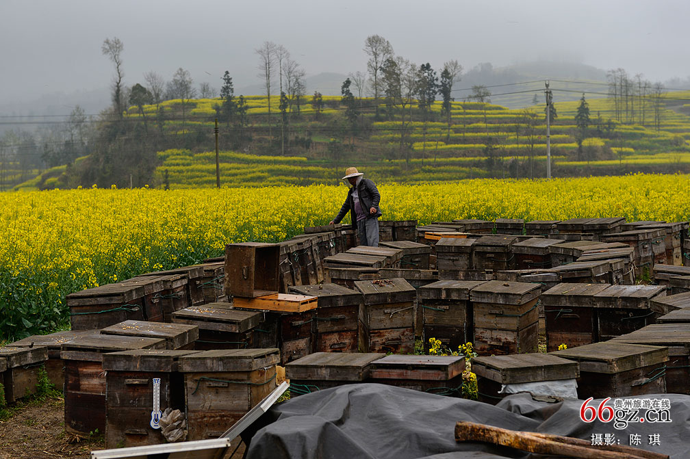 在安顺,每到油菜花盛开的季节,一些外地养蜂人就带着孩子,千里迢迢,追花而来。于是,麦田旁,道路边,草地上,便整齐有序地摆放了一排排蜂箱,养蜂人全家则在运载蜂箱的卡车上遮风挡雨、吃饭睡觉,也算是短暂的安家。不到两星期,花谢了。养蜂人并没有抱怨花期的短暂,而是把蜂箱装上了卡车,继续向北进发了。