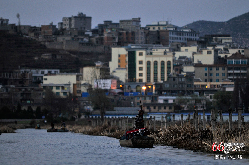三月的草海,确实是一个很迷人的地方,阳光清冷、芳气袭人。夕阳西下,船夫划船归家。船是缓慢平稳的,船底浪花是轻柔涟漪的。我不禁环顾了整个草海的景色,我确信这样的画面,是我所期待的。