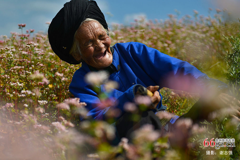 连日来,贵州威宁板底乡种植的几千亩荞麦花竞相绽放,粉红色的甜荞花与绿色的苦荞花交相辉映,芳香扑鼻。吸引众多游客前来观光,老奶奶坐在自家的荞麦地里,乐开了花。