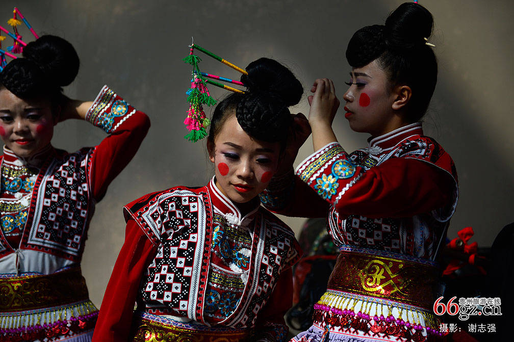 威宁县举行非遗周末聚活动,演员在台下候场,姑娘们相互为彼此整理仪容,以便用更好的状态上台演出。专注的神情吸引了站在一旁的我,于是举起相机定格下了此刻。