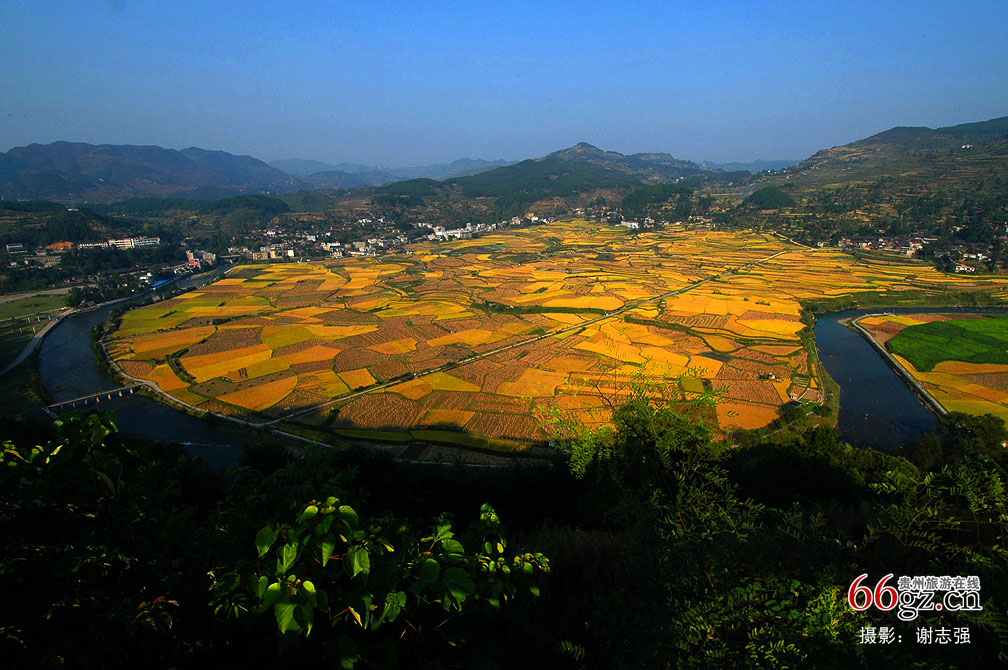 贵阳开阳县禾丰底窝坝,清澈如玉的青龙河,在禾丰大坝上弯出一个英文的U字,如同在此伸了一个优美的懒腰,绕坝流过。春季,田野里春花灿烂;秋季,稻浪连绵起伏。每个季节的底窝坝都被大自然装扮得丰润而醇厚。在观景台俯瞰,整个田坝在青龙河的包围下形似盆而色金黄,故名“玉水金盆”。