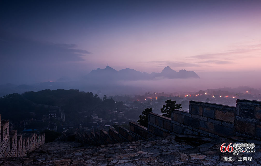 登上青岩古镇的老城墙,薄雾弥漫,独自一人坐在城墙头。属于黎明浅蓝的颜色,由近及远,由浅及深,慢慢的,变成一望无际的海洋。远山边太阳露出笑颜,缕缕阳光照到绿野山坡,整个古镇正在苏醒。