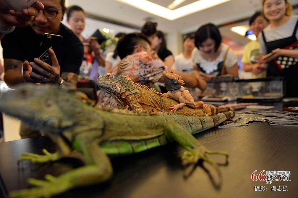 贵阳亨特国际商场正在进行蜥蜴展示活动。只见几只有大有小的蜥蜴活生生的出现在展示台上,皮肤粗糙,颜色斑驳,身上的刺一根根直直地立着,眼神犀利。引来众多看客围观。