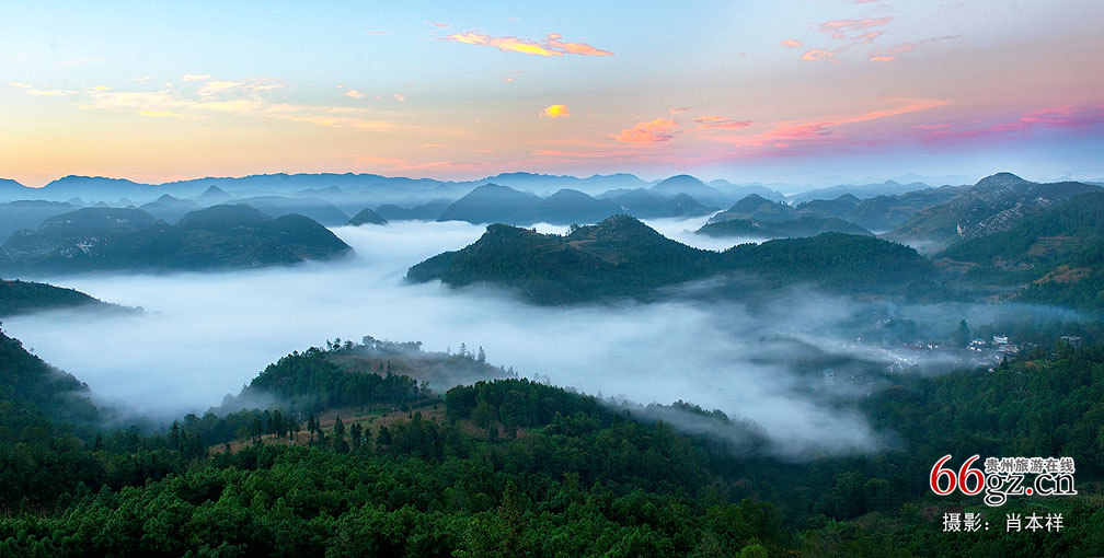 六盘水盘县丹霞山被誉为江南八小佛教名山,它对面有一小谷地,名为“梅子冲”。景色幽美,是摄影爱好者常去之处,也出了不少好作品。梅子冲四周林木葱郁,一片翠绿环绕,每天的晨雾妖娆似水墨,古朴自然引人醉。