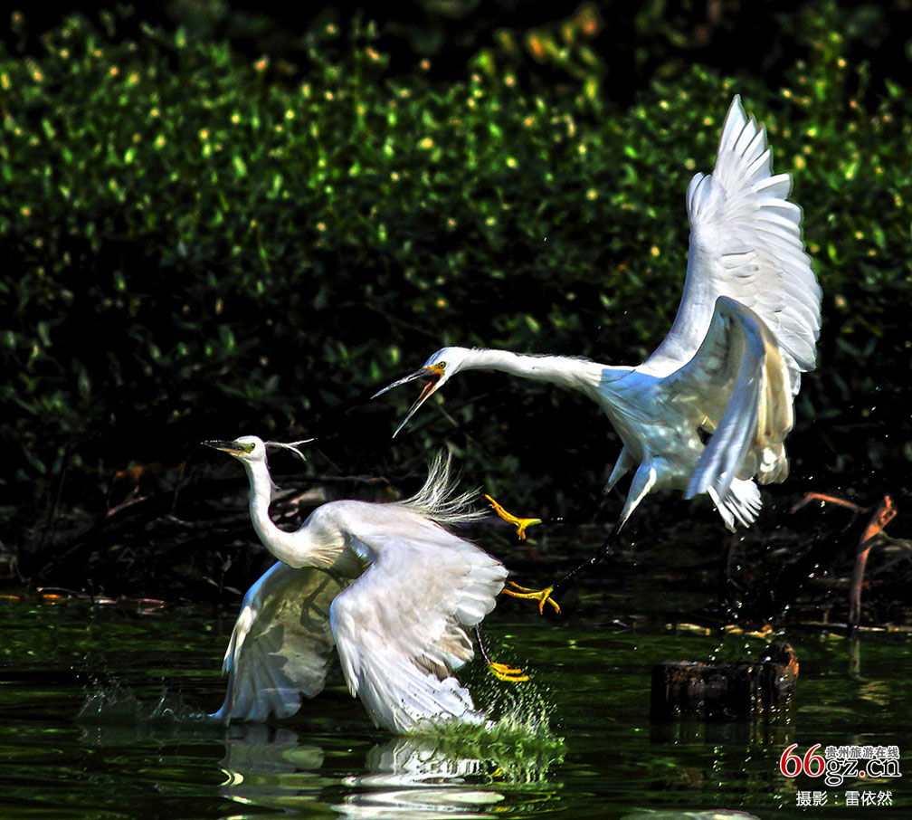 栖息在河边湿地的白鹭群,争战常常愈演愈烈。它们或为争食而斗或为抢地盘而战,精彩的打斗成了人们观赏的风景。(图片源自/“凉都福地·生态水城”原生态全国网络摄影大展参赛作品)