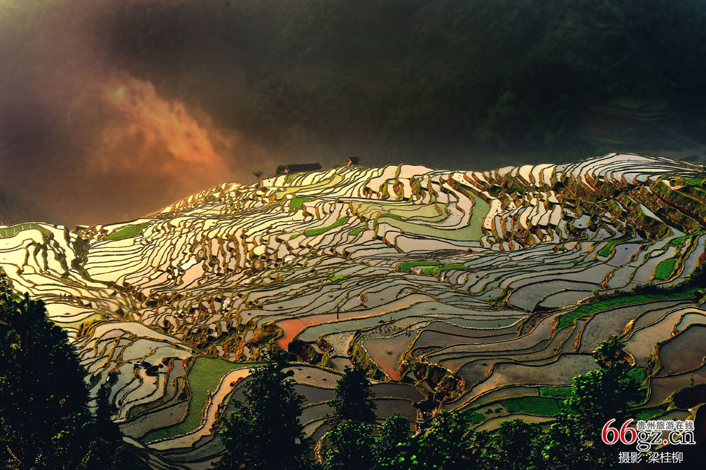 加榜梯田,常年雨水充沛,无论春夏秋冬,每天清晨,一层层云雾从河边缓缓升起,慢慢的,这些美丽的梯田全被笼罩在云雾中,远远望去,依稀可见的吊脚楼,若隐若现,飘渺悠然,让你陶醉在一种梦幻的境地。实为摄影人拍摄佳地。