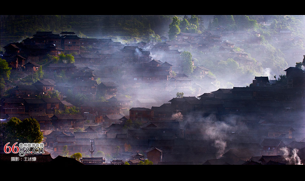 西江苗寨, 在晨曦的炊烟中醒来。晨光与炊烟自然而然地搅合在一起,在飘渺与升腾中,把这个藏在深山里的中国最大的苗寨群落,变成了海市蜃楼般的世外桃源,千户苗寨的生机,也在这幅自然山水画卷中,慢慢舒展,醒来。