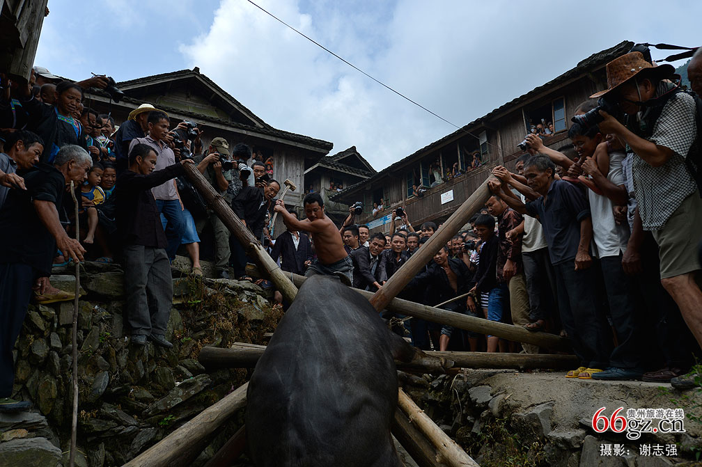 祭天节,贵州省从江县加榜乡加车苗寨特有的民族传统节日。祭祀仪式的最后,要将一头体格健壮的水牛宰杀。男人们把水牛五花大绑倒提固定在木棒上,事前先挖一个坑,把绑好的牛放进坑里,牛头被固定在一个简易的支架上不得动弹,随后便用斧子敲击牛的头部直至死亡。用事先做好的纸钱抹上牛血,用于供奉祖先。再割下牛角摆放在神圣的祭坛之上来祭天。用牛作祭品,是上古社会巫仪中的一种普遍仪式。