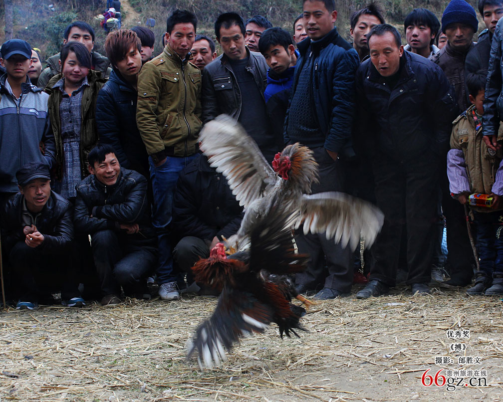 贵州少数民族农闲时节喜欢各种动物逗趣比赛,“斗鸡”就是其中之一。要说贵州山里的斗鸡比赛,场面是相当惊心动魄的。看斗鸡的观众经常是里三层外三层,个个脸红脖子粗,又叫又跳。公鸡主人绝对是挑动“武斗”的专家,他们懂得如何鼓舞公鸡的斗志,让它们厮杀,咬打。在当地男人眼里,斗鸡象征着勇敢。(图片源自/贵州省艺术摄影学会2014年02月月赛优秀奖作品)