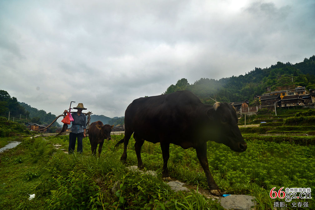 春夏是牧牛的季节。清晨,黄牛迈着沉稳的步子走在前头,身后跟着一头小黄牛,老者头戴斗笠,肩扛犁具,腰系刀架。乡民们总是日出而作,日落而息。金色的朝阳中,他们又开始了新一天的工作。