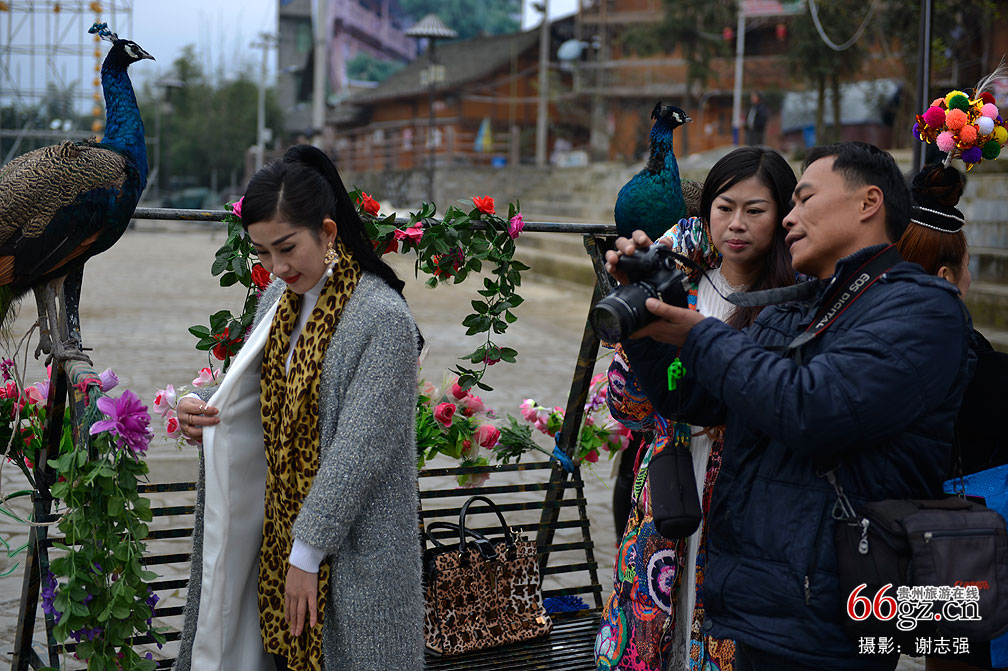 榕江萨玛节期间,民族歌舞展演让游人零距离享受了视听盛宴,而节日活动现场的流动照相馆却吸引了我的眼球。商贩带着两只活孔雀作为拍照的道具,有人来照相,会给客人打扮一番,跟孔雀留影,吸引了不少爱美女士的光顾。