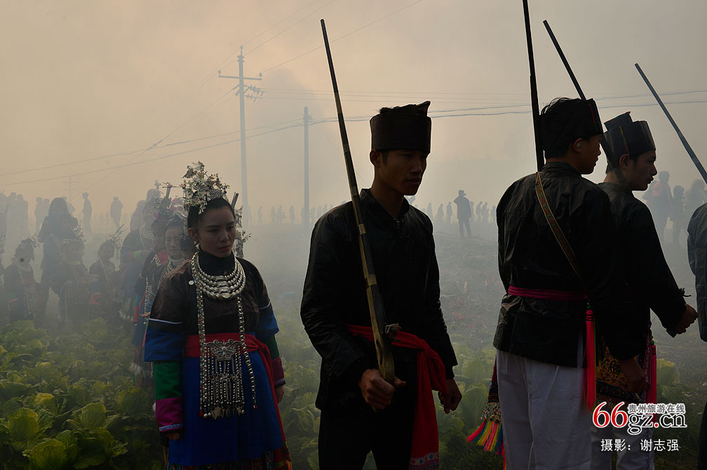 正月初一,贵州省从江县贯洞镇龙图片区侗寨举行盛大的“赶略”活动。活动在萨堂启动,男女老少几千人着侗族盛装举行“祭萨”活动后,男人扛着火枪把“魔兽”驱逐出寨,全体人员齐聚田坝,朝天鸣放火枪、鞭炮,庆祝侗族领袖“萨”带领群众取得战争的胜利之情。